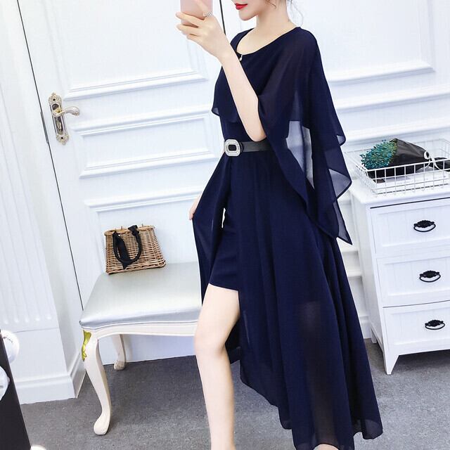 シフォン 胸元フリル ロング ミニスカート スリット マキシロング丈 マキシ丈 ドレス ワンピース かわいい3697592