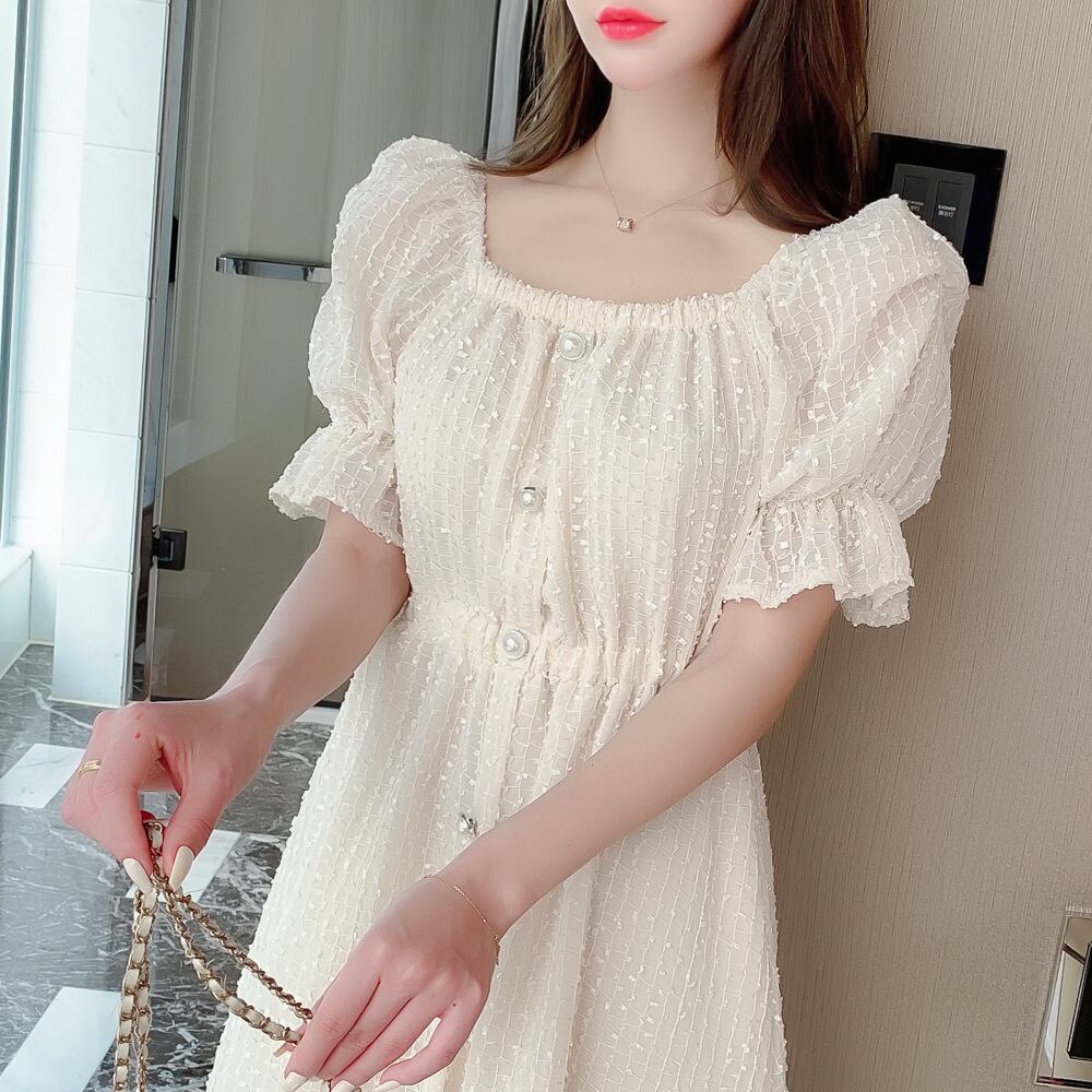 ドレス 薄手 パール バックル ロング ホワイト スカート マキシロング丈 マキシ丈 白 スクウェア スクエア 女性 レディース ガーリー_フェミニン2093790