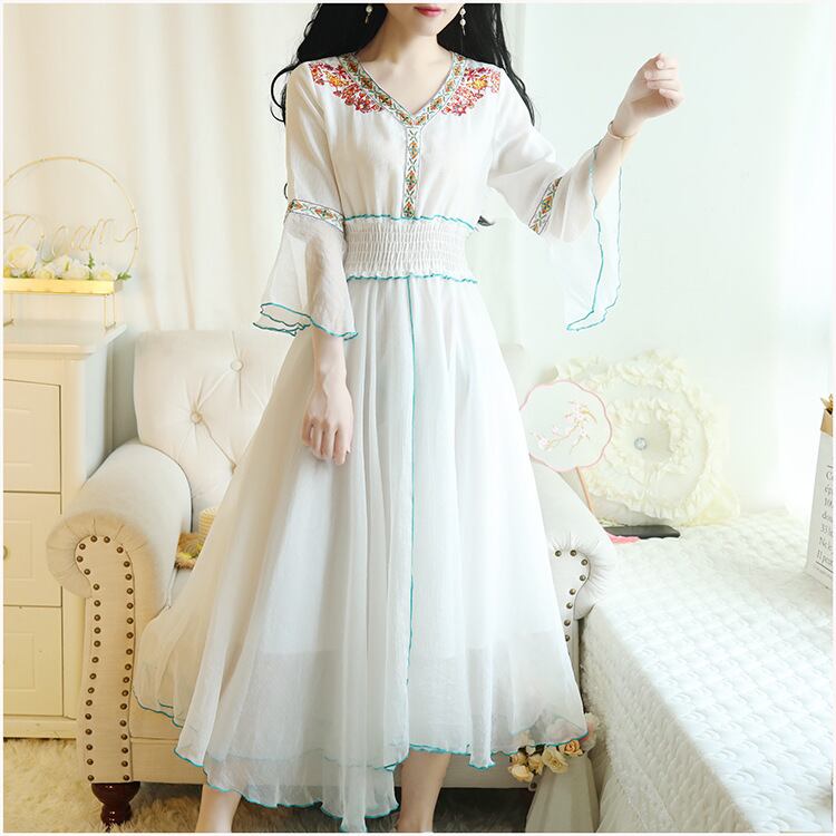 ドレス ワンピースナチュラルスタイルVネック刺繍ストレッチウエストスカート エラスティック 伸縮 女性 レディース かわいい0002823