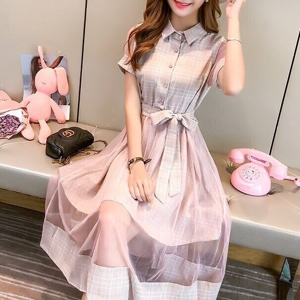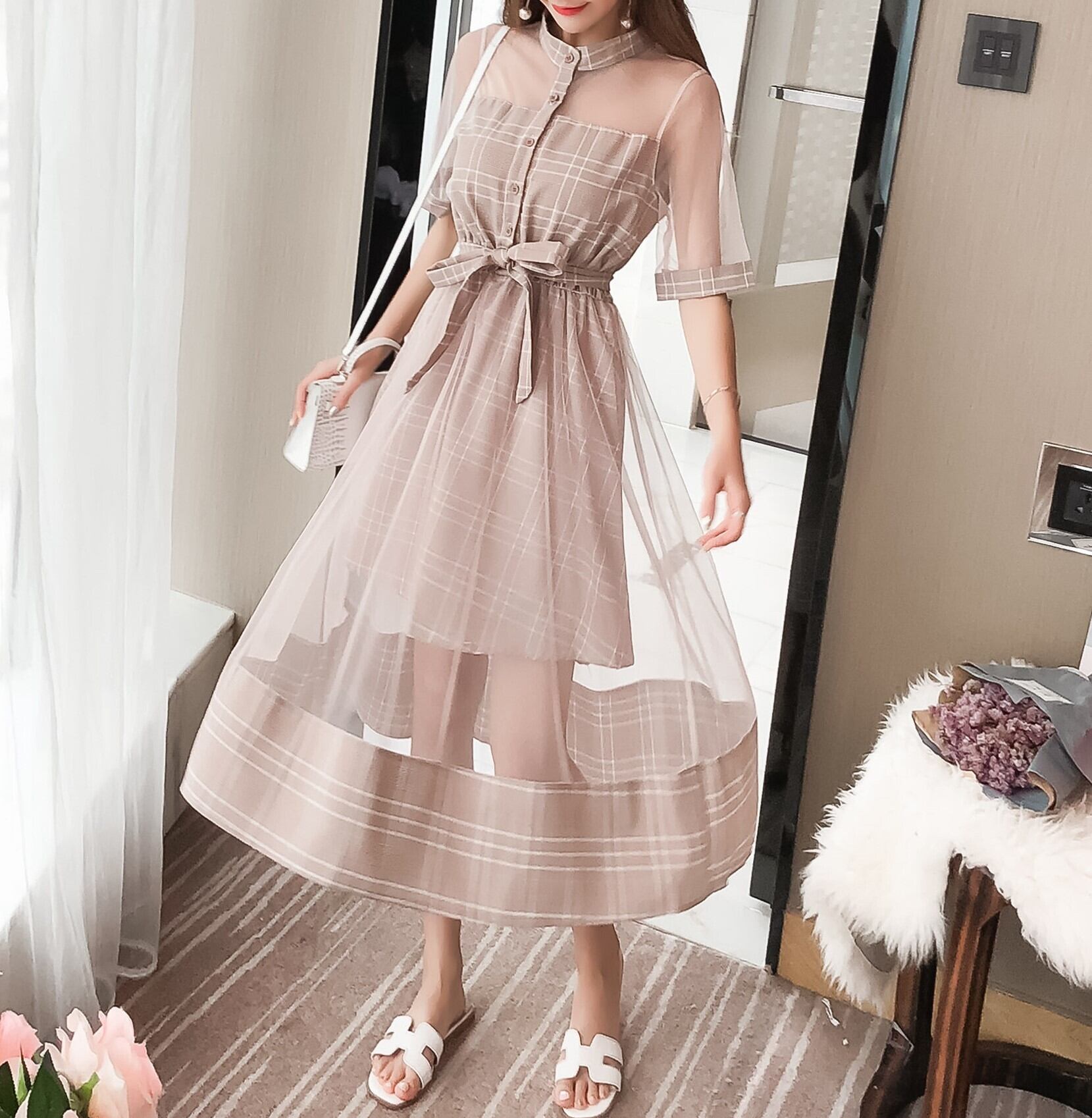 チェック レース シースルー チュール オーガンジー ロング マキシ ロング丈 マキシ丈 ワンピース ドレス 4525571