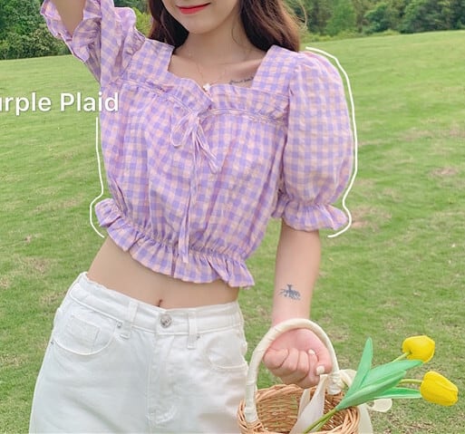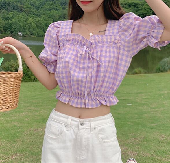 ショート ショート丈 ミニ ミニ丈 格子柄 ギンガムチェック パフスリーブ シャツ トップス レディース 半袖 半そで スクウェア スクエア 女性 レディース0388627