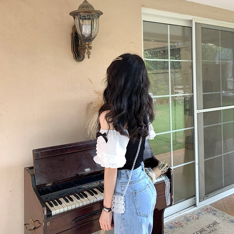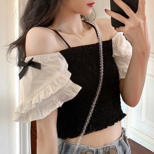 リボン ショート ショート丈 ミニ ミニ丈 ブラウス シャツ トップス かわいい 可愛い ガーリー 大人可愛い 大人かわいい フェミニン 大人ガーリー 肩出し オフショルダー オフショル 女性 レディース1933442