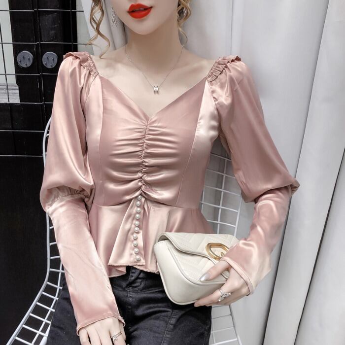 サテン 光沢 シャツ パールボタン 女性 レディース リボン73867132241