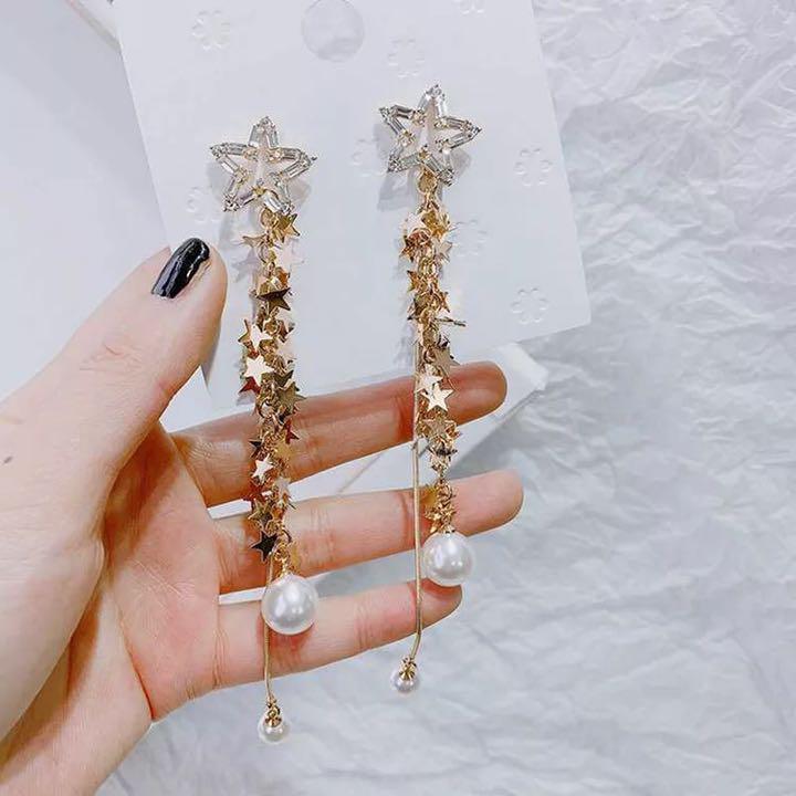 スター 星 パール キラキラ 揺れる ゆれる デコストーン ドロップ ピアス チェーン タッセル イヤリング レディースアクセサリー